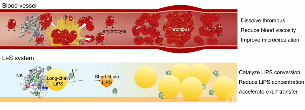 近日,受纳豆激酶(NK)溶解血栓和改善血液微循环功能的启发,sunbet申愽杨植教授、杨硕副教授团队与中国科学技术大学江俊教授团队联合开发了一种高效的多硫离子转化仿生酶用于碳纳米管负载硫正极——NK及其肽基模拟酶(丝氨酸-组氨酸-天冬氨酸三联体活性中心,Ser-His-Asp)。密度泛函理论计算、原位光谱和电化学分析,揭示了其独特的催化机制:天冬氨酸(Asp)强电负吸附固定LiPSs,丝氨酸(Ser)电子轴拉伸催化S-S键断裂,组氨酸(His)亲锂位点促进电荷/Li⁺传输。通过机器学习优化配方,该催化剂显著提升了贫电解液条件下的SRR动力学,实现高倍率容量(744 mAh g⁻¹,5 C)、长循环寿命(250圈容量衰减率0.096 %)和高面积容量(8.87 mAh cm⁻²,E/S=4 μL mg⁻¹)。这一研究结果从生物酶到电化学,跨界创新,重新定义了锂硫电池催化的未来。