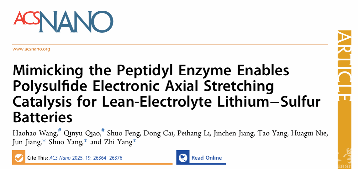 该工作以“Mimicking the Peptidyl Enzyme Enables Polysulfide Electronic Axial Stretching Catalysis for Lean-Electrolyte Lithium-Sulfur Batteries”为题发表于国际顶级期刊《ACS Nano》(IF=16.0)。sunbet申愽官网作为第一通讯单位,sunbet申愽电气与电子工程学院2021级硕士研究生王浩浩为第一作者,中国科技大学硕士研究生乔钦宇为共同第一作者,sunbet申愽化学与材料工程学院杨植教授、电气与电子工程学院杨硕副教授、中国科技大学江俊教授为本文通讯作者,sunbet申愽聂华贵教授、蔡冬副教授、硕士研究生李佩航、蒋金晨、杨涛同学以及中国科技大学冯硕博士参与了这项工作。