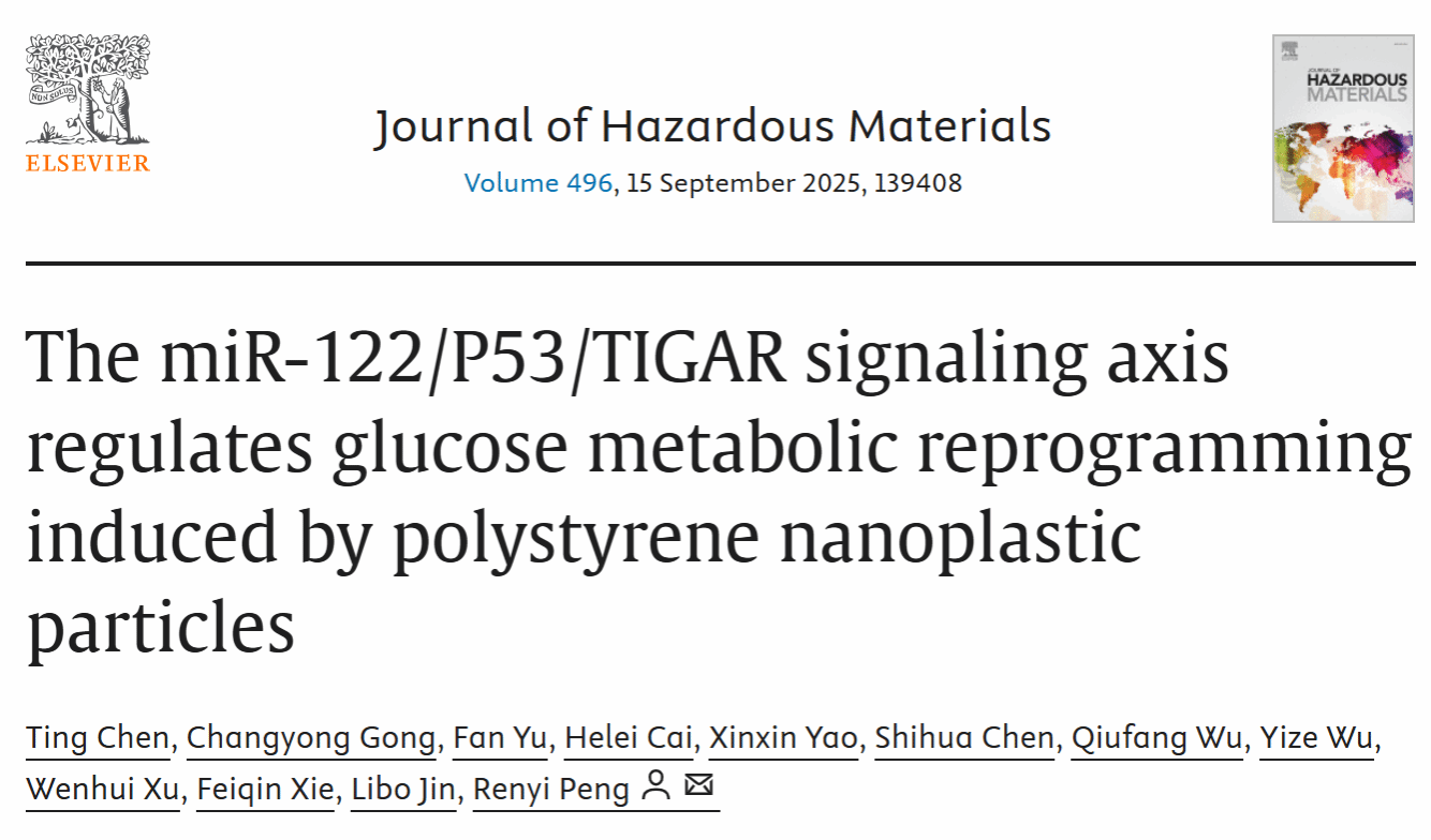 近日,sunbet申愽官网生命与环境科学学院彭仁义课题组在中科院一区期刊《Journal of Hazardous Materials》(IF=11.3)发表了题为“The miRNA-122/P53/TIGAR signaling axis regulates glucose metabolic reprogramming induced by polystyrene nanoplastic particles”最新研究。该研究聚焦聚苯乙烯纳米塑料(PS-NPs)污染这一全球性威胁,深入探究其通过靶向miRNA-122对糖代谢重编程的复杂影响机制。