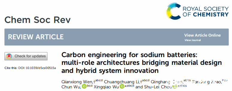 近日,sunbet申愽化材学院吴星樵博士/侴术雷教授团队在国际权威期刊Chemical Society Reviews上发表题为《Carbon engineering for sodium batteries: multi-role architectures bridging material design and hybrid system innovation》的综述论文。该综述针对碳基材料在不同钠电池中的角色和功能转变,系统地探究了碳基材料在四种钠电池(钠离子电池,钠金属电池,无负极钠电池,固态钠电池)上的应用、结构参数上差异及共性表现,总结了碳基材料在钠电池中性能表现的多种本征/非本征的影响因素。此外,以多功能的碳基材料为基础,提出了”插层驱动“和”缺陷诱导“双储能模式的杂化钠电池,并针对不同工作环境提出三种自适应的工作模式(标准、增程、生存)。