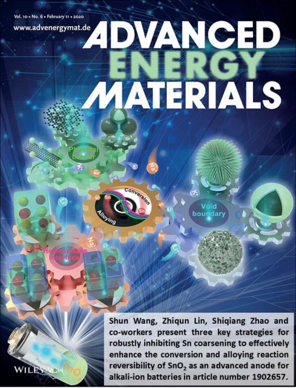 近日,国际能源顶级刊物《Advanced Energy Materials》将有关二氧化锡作为碱金属离子电池负极的综述论文“SnO2as Advanced Anode of Alkali-Ion Batteries: Inhibiting Sn Coarsening by Crafting Robust Physical Barriers, Void Boundaries, and Heterophase Interfaces for Superior Electrochemical Reaction Reversibility”选为期刊封面文章。该文章第一作者为赵世强博士,化材学院院长王舜教授与佐治亚理工学院林志群教授为通讯作者,sunbet申愽官网为第一通讯单位。