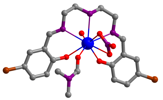 化材学院2017级化学专业本科生袁碧晨在课题组前期实验研究的基础上,合成了2个新的含(CH2)2NH(CH2)2骨架的柔性席夫碱配体。利用这两个具有良好配位性能的柔性配体,合成了2个单核稀土配合物[LnL1(NO3)(H2O)DMF] (Ln = Nd (1) and Yb (2))和2个双核稀土配合物[Ln2(L2)2(OAc)2] (Ln = Nd (3) and Yb (4))。通过X-射线晶体学手段确定了这四种配合物的晶体结构。席夫碱配体在配合物1-4中呈“折叠”结构,其官能氮、氧原子与稀土离子配位。席夫碱配体的长度约为18 Å,有助于形成大尺寸金属配合物。有趣的是,双核配合物3和4具有纳米尺寸结构,它们的分子大小约为7 × 11 × 16 Å。能量色散X射线光谱分析表明,它们的Nd:Br:O摩尔比与晶体结构一致。发光性能研究表明,这些配合物中的席夫碱配体能有效地将能量转移给稀土离子,使它们显示出稀土离子的近红外发光。同时,研究表明,由于具有较高的分子内传能效应,配合物3和4的近红外发射量子产率分别高于配合物1和2。该研究对如何通过设计合成新的柔性有机配体,达到调控不同稀土配合物结构及性能的目的,具有较好的理论指导意义。相关结果在国际期刊Journal of Rare Earths(SCI二区期刊,DOI:10.1016/j.jre.2019.02.014,2020,38,143-147)上发表。