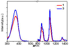 图2. 稀土配合物1-4的激发及近红外发射谱图。