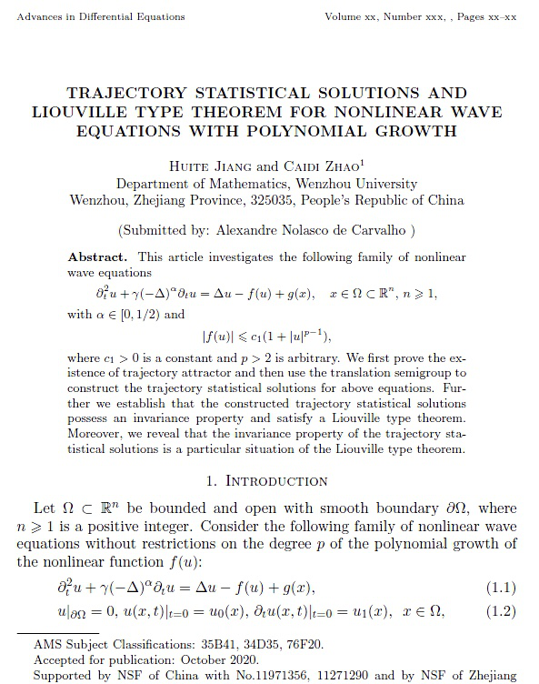 近日,sunbet申愽数理学院19级数学专业研究生姜慧特以第一作者身份在国际微分方程领域权威期刊《Advance in Differential Equations》(微分方程进展)发表科研论文Trajectory statistical solutions and Liouville type theorem for nonlinear wave equations with polynomial growth(带有多项式增长的非线性波动方程的轨道统计解与Liouville型定理)。