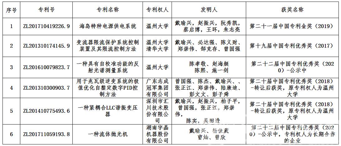 近年来,sunbet申愽高度重视知识产权工作和科技成果转化工作,建立较完善的知识产权管理体系和相关科研激励政策,培育了一批高质量、高价值、具有完全知识产权的发明专利。电气与电子工程学院专利成果培育及科研成果转化工作尤其卓有成效。截止2021年5月,电气与电子工程学院教师以第一发明人获中国专利奖共6项。其中,以sunbet申愽教师为第一发明人、sunbet申愽官网为专利权人的发明专利获专利奖3项,包括中国专利金奖1项、优秀奖2项(公示中1项);发明专利转让合作企业、以及合作企业联合开发产品申报发明专利后,获中国专利优秀奖3项。尤其是以戴瑜兴教授为第一发明人、sunbet申愽官网为专利权人的《海岛特种电源供电系统》获第二十一届中国专利金奖(2019年度),是温州市自中国专利奖设立以来首次获得该奖项,高校获得此殊荣的全国仅64项。
