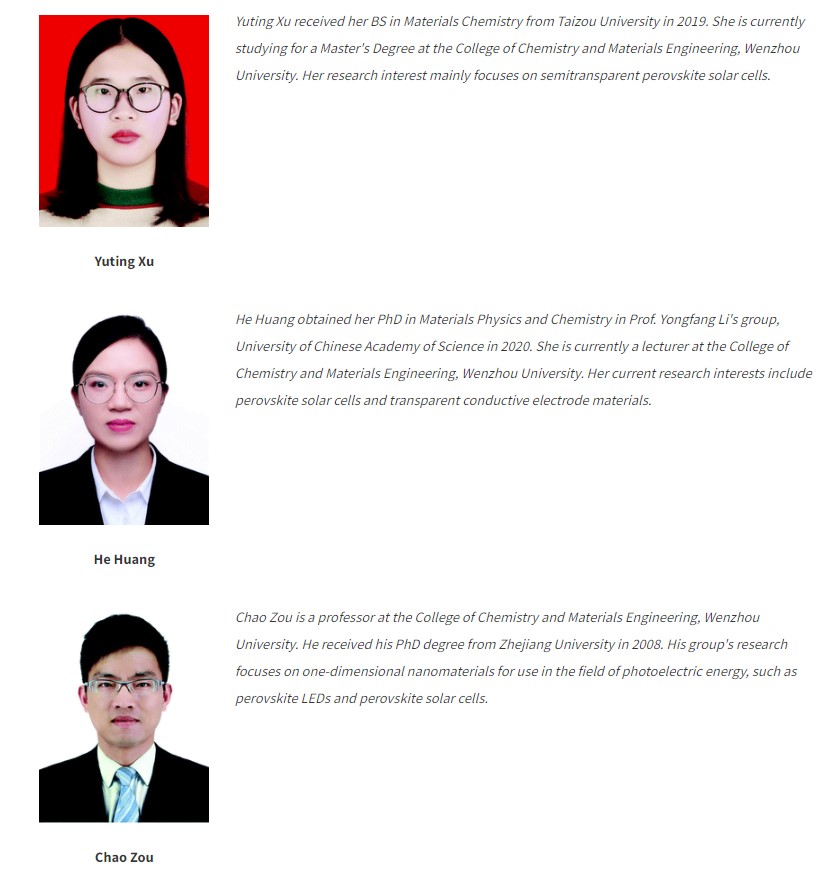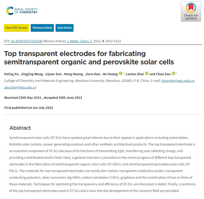 近日,sunbet申愽2019级材料科学与工程专业硕士研究生许宇婷在权威期刊Journal of Materials Chemistry C上发表题为Top transparent electrodes for fabricating semitransparent organic and perovskite solar cells(顶部透明电极在制备半透明有机和半透明钙钛矿太阳能电池方面的应用)的综述论文,通讯作者为邹超教授和黄合博士。