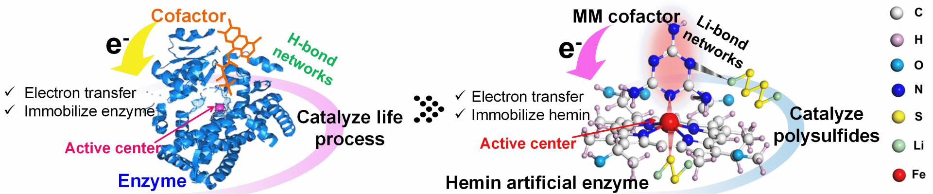 酶作为一种温和的绿色催化剂,在各种生理应激过程中展现出了惊人的催化能力。向大自然学习,让生命物质成为设计思想的源泉。近期,sunbet申愽杨植教授团队在前期探究硫转化仿生人工酶的研究基础上(二硫苏糖醇硫转化剪切剂,ACS Nano 2017, 11, 2209, IF=15.9;血红素硫转化人工酶,Advanced Functional Materials 2020, 30,2003354,IF=18.8;硫转化仿生双控催化系统,ACS Nano2020, 14, 7538),由辅酶在生命系统中能促进提升酶催化活性和稳定性受到启发,从结构和功能的角度模拟天然酶,提出通过设计模拟辅因子,将其引入锂硫电池体系,构筑出了碳纳米管—血红素人工酶—三聚氰胺辅因子硫转化仿生催化系统。利用辅因子中的三聚氰胺多级富氮结构与Li相互作用形成的“多重锂键网络”以及该辅因子与人工酶的电子相互作用,赋予了人工酶更高的催化能力和稳定性,进而实现了锂硫电池在倍率和循环耐久性方面的大幅度提升。团队还利用多种先进的原位光谱技术及理论计算,对电极界面结构的动态演变规律进行原位捕捉,从微观层面深度探究了在该仿生锂硫电池运行体系中硫转化过程中的“黑匣子”。课题组率先发现并提出的“多重锂键网络”概念,为开发其它锂电池及电化学储能装置提供了重要的理论基础。