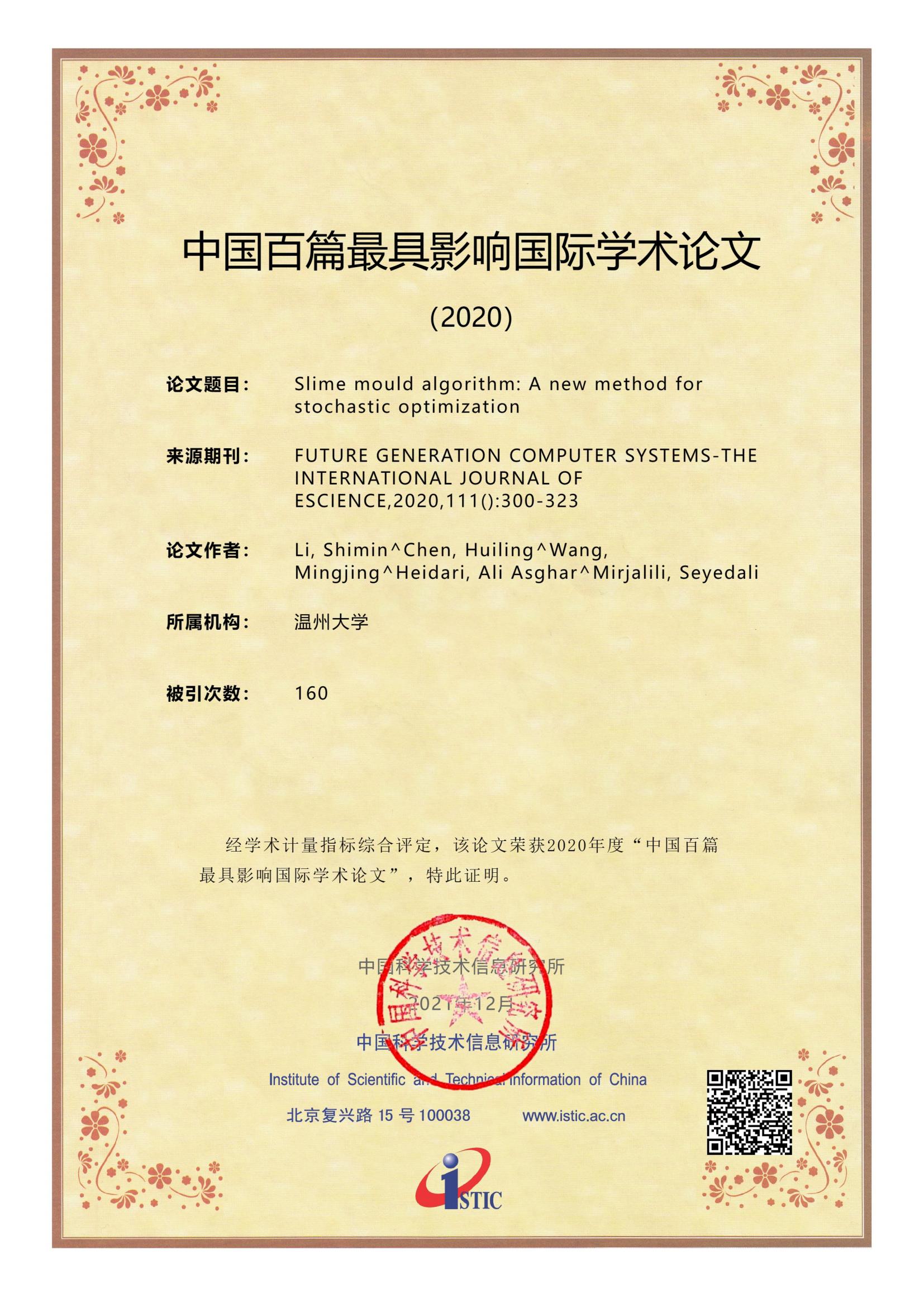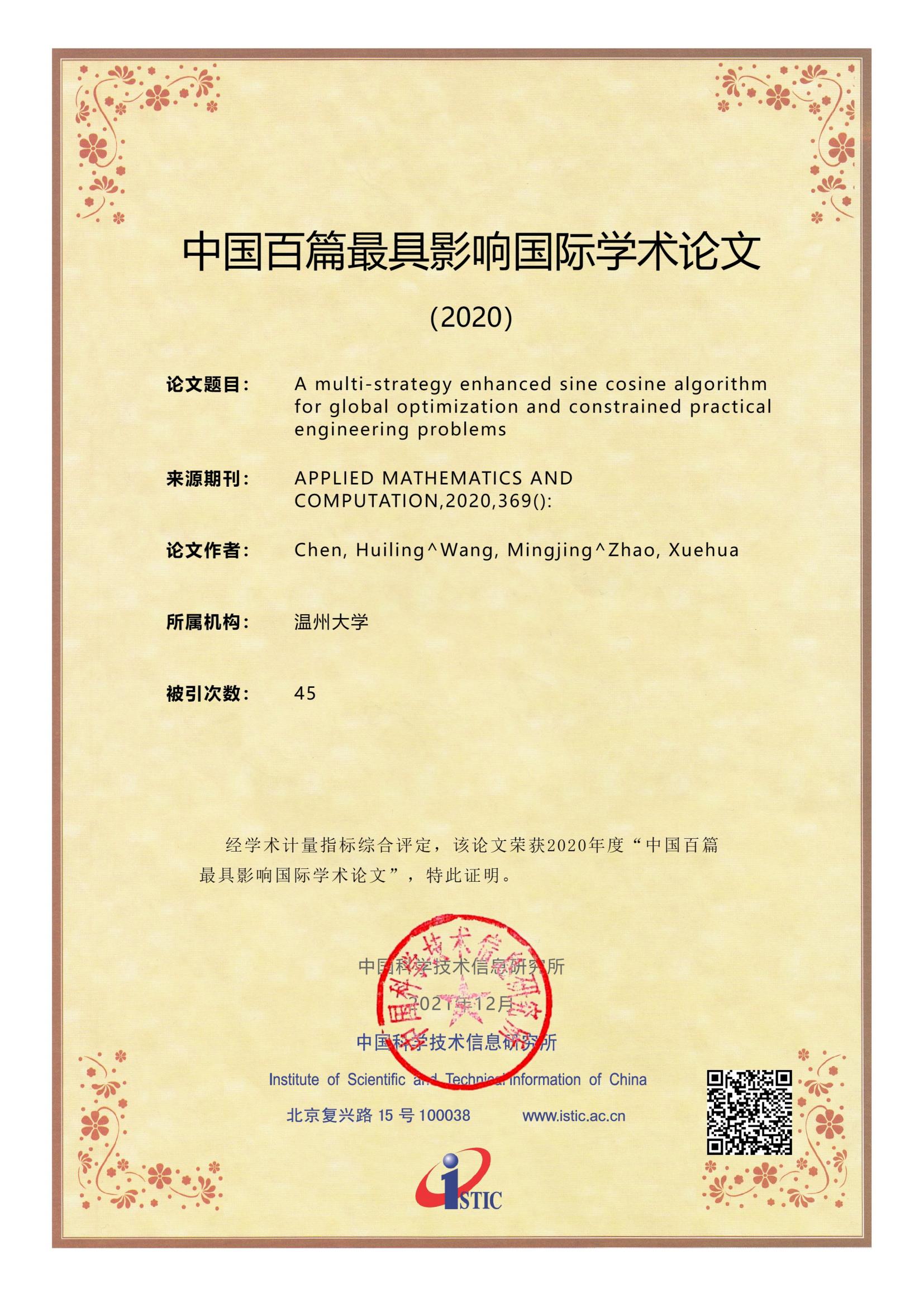 2021年12月27日,科技部直属的国家级公益类科技信息研究机构-中国科学技术信息研究所发布《2021年中国科技论文统计报告》,并评选出2020年“中国百篇最具影响国际学术论文”。sunbet申愽官网陈慧灵瓯江特聘教授团队2篇论文《A multi-strategy enhanced sine cosine algorithm for global optimization and constrained practical engineering problems》、《Slime mould algorithm: A new method for stochastic optimization》同时入选。