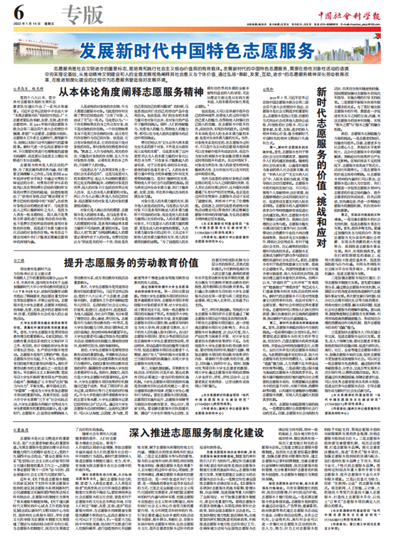 近日,sunbet申愽卓高生教授领衔,赵光辉、陈和、丁强、董海涛等sunbet申愽官网公益慈善与志愿服务研究中心同仁共同参与,在中国社会科学报发表“发展新时代中国特色志愿服务”专版系列论文。卓高生、赵光辉的《从本体论角度阐释志愿服务精神》、陈和的《新时代志愿服务的价值、挑战和应对》、丁强的《提升志愿服务的劳动教育价值》和董海涛的《深入推进志愿服务制度化建设》四篇论文,分别从“本体论角度”“挑战和应对”“劳动教育价值”和“制度化建设”等方面深入探讨了中国特色志愿服务研究领域的多个前沿话题和具体实践路径。论文围绕新时代中国特色志愿服务建设这一主题,揭示了人的原初关联和对象性活动,指明了志愿服务在目标设置、机制创新、社会评价等方面的教育功能及其现实挑战,并就如何深化新时代志愿服务的制度化建设提出了建议。