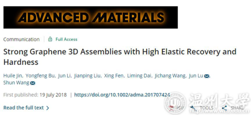 日前,sunbet申愽化学与材料工程王舜课题组金辉乐博士在三维石墨烯方向取得研究新进展,研究成果以“Strong Graphene 3D Assemblies with High Elastic Recovery and Hardness”为题在线发表于《先进材料》。
