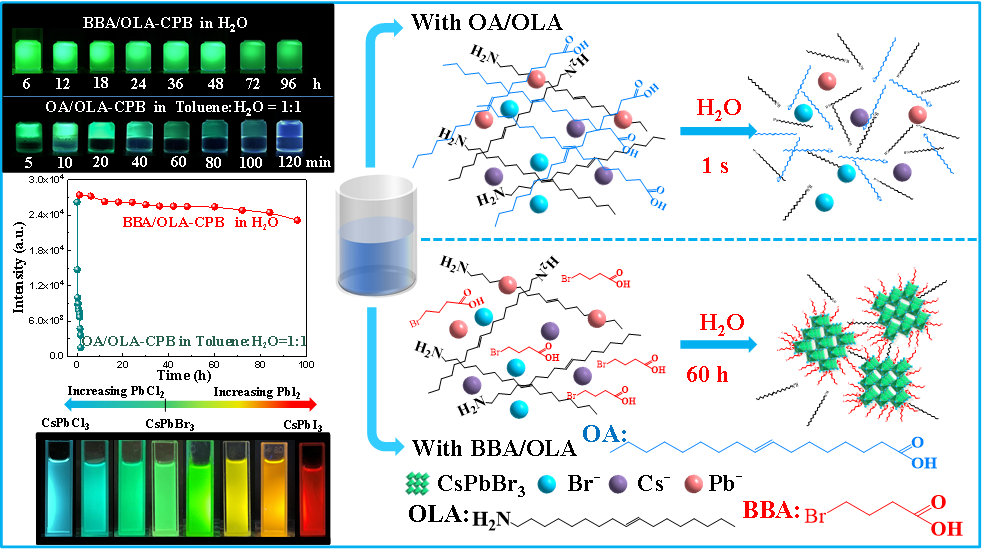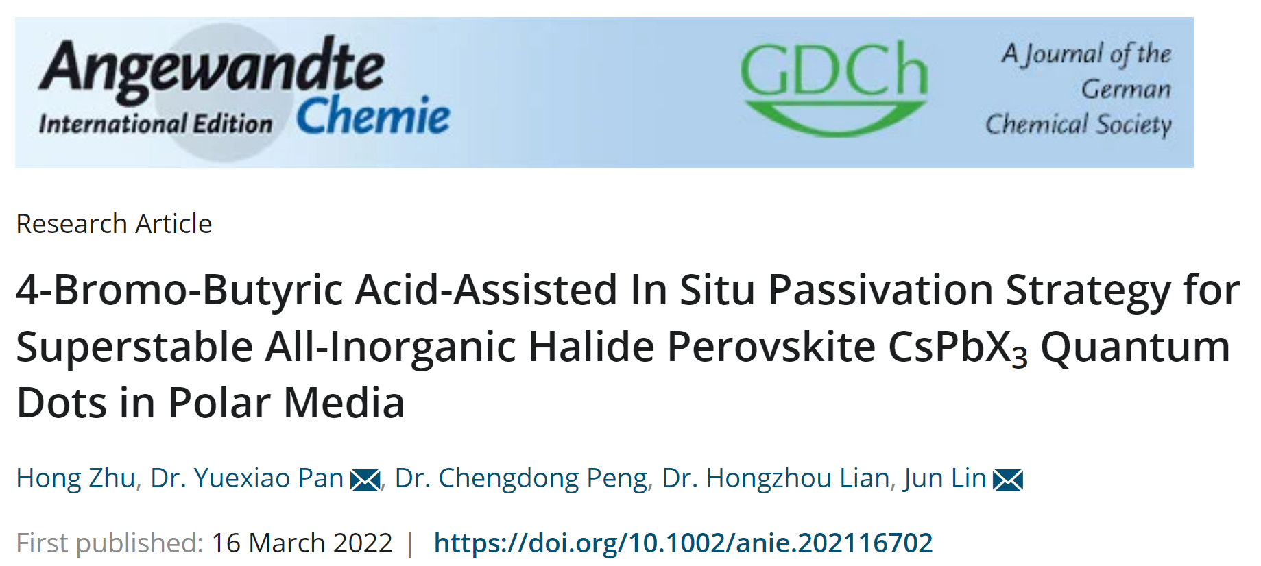 近日,sunbet申愽潘跃晓教授课题组在国际顶级化学期刊《Angewandte Chemie International Edition》发表了题为“4-Bromo-Butyric Acid-Assisted In Situ Passivation Strategy for Superstable All-Inorganic Halide Perovskite CsPbX3 QDs in Polar Media”的论文。该论文通过原位钝化策略显著提高CsPbX3量子点在水等极性溶剂中的稳定性,并提出了一种可能的基本机制。