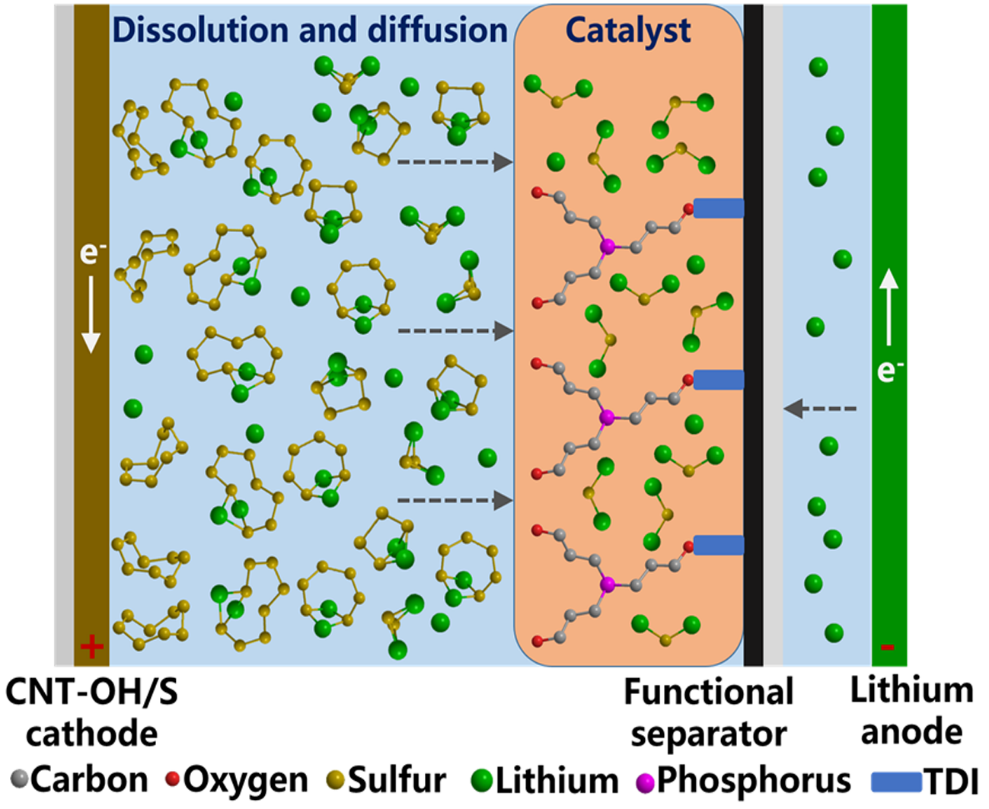 近日,sunbet申愽陈锡安教授课题组在国际顶级期刊《Angewandte Chemie International Edition》发表题为“Hydroxylated Multi-walled Carbon Nanotubes Covalently Modified with Tris(hydroxypropyl) Phosphine as a Functional Interlayer for Advanced Lithium-Sulfur Batteries”的论文。该工作开发了一种三(羟丙基)膦共价改性羟基化多壁碳纳米管作为先进锂硫电池的功能层。利用三(羟丙基)膦(THPP)作为锂硫电池功能插层中的活性物质,能够快速将液相多硫化锂(Li2Sn, 4≤n≤8)催化转化固相硫化锂(Li2S),从而有效抑制多硫化物穿梭效应。同时能够诱导锂负极表面形成稳定的固体电解液中间相(SEI)层,进而减少锂负极枝晶的形成。并揭示了有机小分子THPP催化多硫化物过程中形成的活性中间体,对锂硫电池中有机小分子催化多硫化物的作用机制提供了一个新的见解。