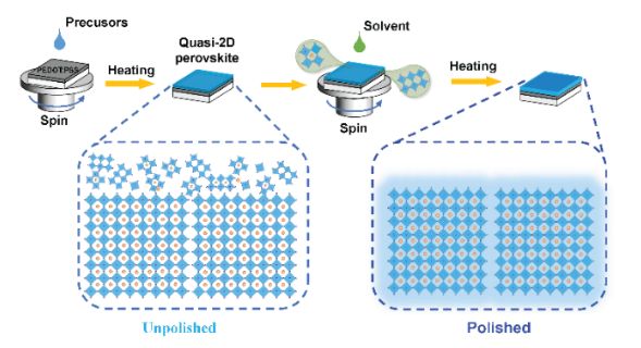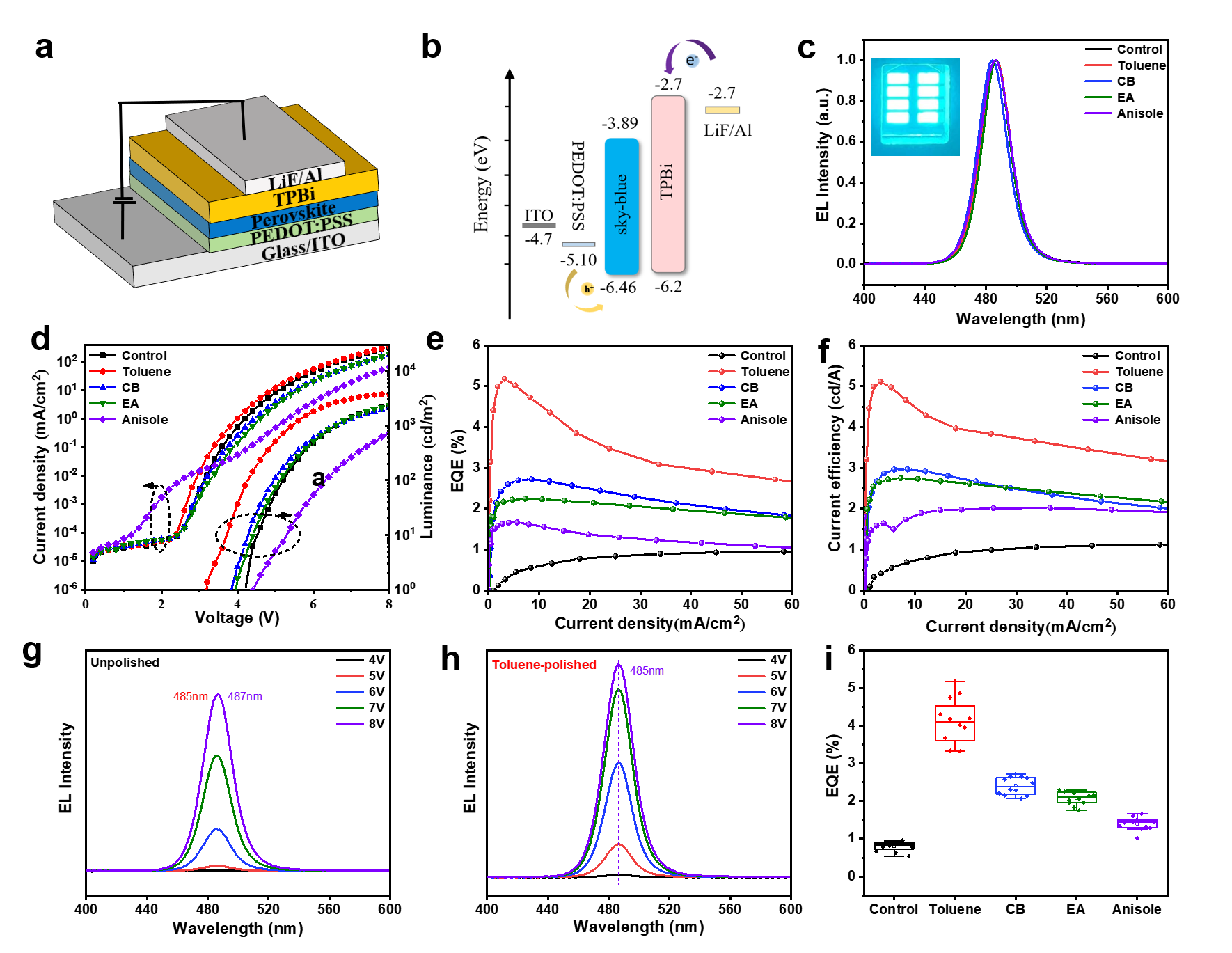 近日,sunbet申愽官网邹超课题组提出了一种溶剂抛光策略,在不影响载流子输运的前提下有效去除钙钛矿表面的富缺陷层,并有效减少非辐射复合中心n=1相的形成。通过系统研究抛光效果与溶剂极性的关联,确定甲苯溶剂能够在最大限度维持钙钛矿薄膜性质的基础上有效消除缺陷。研究中实现了高效的蓝光PeLED器件,在485 nm处的最大EQE为5.18 %,最高亮度为3737 cd m-2,启亮电压为3.2 V,分别比未抛光的PeLED器件(启亮电压:4.2 V)高出545 %和162 %。这项研究在不损失载流子输运效率的前提下为缺陷消除提供了一种新思路,以实现高效的蓝光PeLED。