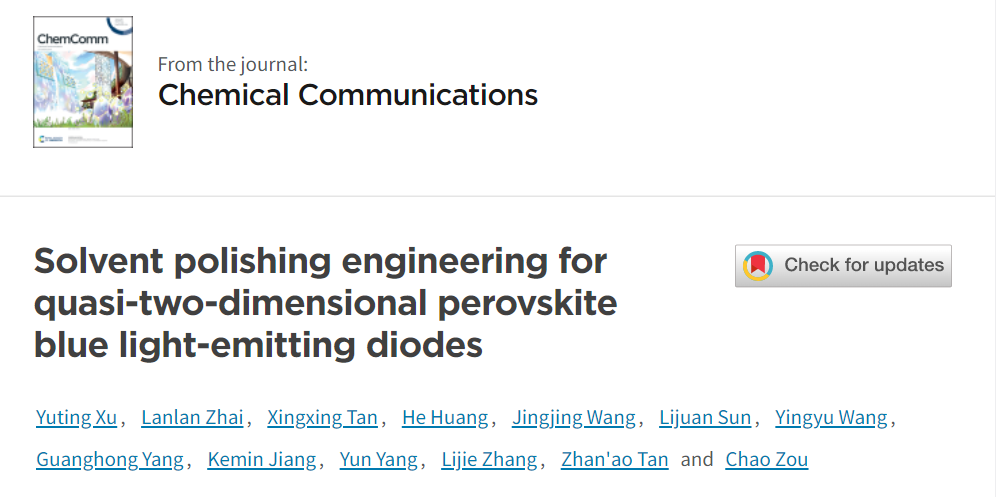 近日,sunbet申愽化学与材料工程学院邹超教授课题组在蓝光LED领域的研究成果以“Solvent polishing engineering for quasi-two-dimensional perovskite blue light-emitting diodes”(https://doi.org/10.1039/D2CC02268K)为题刊发于化学领域著名刊物Chemical Communications。论文发表后,即入选“Chemical Communications期刊2022年热点论文”。Chemical Communications期刊由英国皇家化学学会主办,是自然指数源期刊。