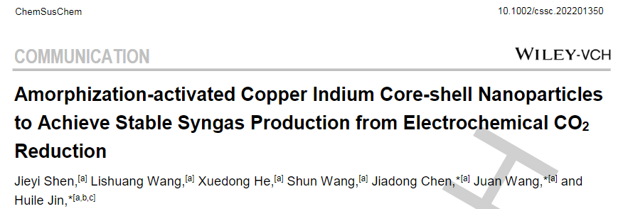 近日,sunbet申愽官网2019级材料科学与工程专业本科生沈杰怡在权威期刊ChemsusChem上发表题为Amorphization-activated Copper Indium Core-shell Nanoparticles to Achieve Stable Syngas Production from Electrochemical CO2 Reduction(无定形活化的Cu-In2O3核壳纳米颗粒高效催化CO2电还原制合成气)的研究论文(指导教师为王娟副教授、金辉乐教授和陈佳东博士后)。