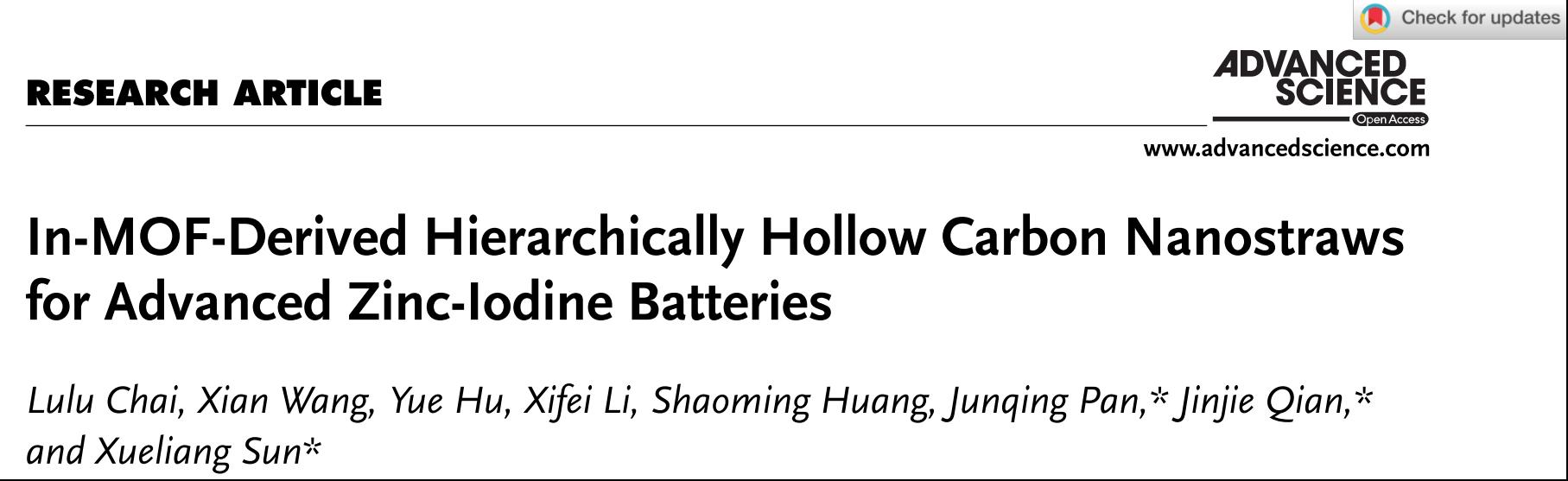 因此,本研究工作为锌离子电池和锂离子电池等高比能量二次电池的未来发展提供一种通用多孔的中空碳材料载体的可控制备策略。这一研究结果以“In-MOF-Derived Hierarchically Hollow Carbon Nanostraws for Advanced Zinc-Iodine Batteries”为题发表在《Advanced Science》,sunbet申愽官网作为第一通讯单位,2020届研究生柴路路为第一作者,sunbet申愽官网钱金杰副教授、北京化工大学潘军青教授和加拿大西安大略大学孙学良院士为共同通讯作者,该工作得到国家自然科学基金(21601137)、中国科学院结构化学国家重点实验室(20190008)、温州市基础科学研究项目(G20190007,ZG2017027)、sunbet申愽官网研究生科研基金(316202001022)的资助。