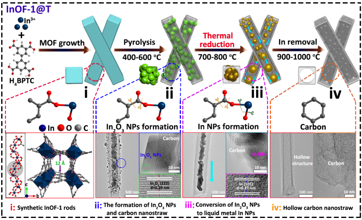 近日,sunbet申愽钱金杰课题组通过对In-MOF热裂解过程中配体脱羧和氧化铟纳米颗粒氧化还原反应的调控,进而形成的液态金属铟通过熔聚和重力作用从碳纳米内腔中聚集流出形成空腔,从而获得中空结构的多孔碳材料(HCNS)。这种纳米秸秆形状的HCNS催化剂具有远高于CNTs的电化学交换能力。HCNS具有更多的电荷活性位点、短而快速的电子和离子传输途径,以其独特的内腔和管壁上相互连接的多孔结构,成功获得新一代高性能理想正极材料。其中,HCNS/I0.5展现出优于商业CNTs材料的高比容量(484.9 mAh g-1@1 A g-1)和较好的倍率性能。在此基础上组装的锌碘电池在1 A g-1时提供了246.6 mAh g-1的高容量,保证了电解液中碘物质的吸附和溶解平衡,极大地提高了该电池的倍率和循环性能,从而获得了优异的容量保持率。
