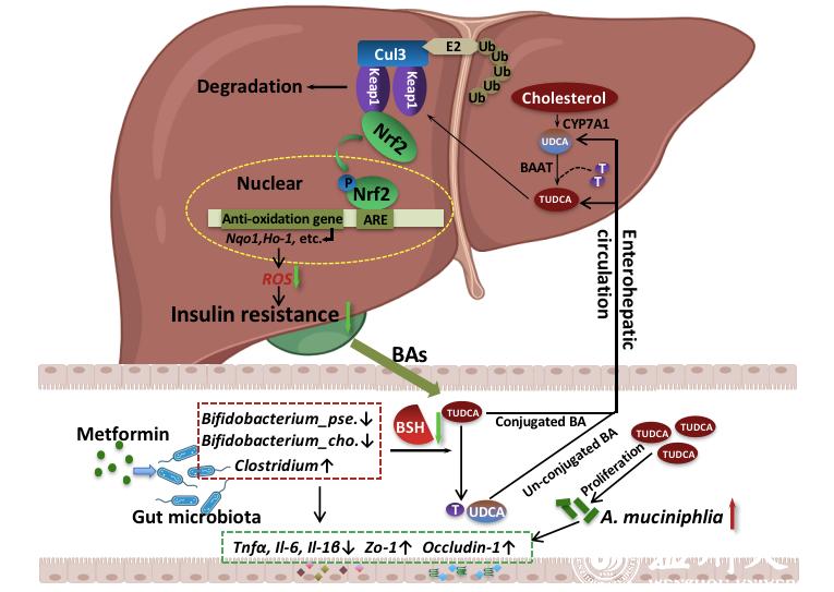 针对上述科学问题,课题组利用高通量测序和代谢组学技术,发现二甲双胍能够重塑肠道菌群组成和丰度,并通过抑制胆盐水解酶活力提高肠道中结合型胆汁酸——牛磺酸熊去氧胆酸(TUDCA)的含量;TUDCA通过胆汁酸的“肠肝循环”途径回到肝脏,并通过阻断KEAP与Nrf2的结合,激活抗氧化Nrf2/ARE信号通路,从而清除肝细胞过度积累的活性氧,增强胰岛素信号转导。该研究揭示了二甲双胍胰岛素增敏作用的新机制,并发现TUDCA是治疗代谢综合征的潜在先导化合物,具有重要的临床意义。