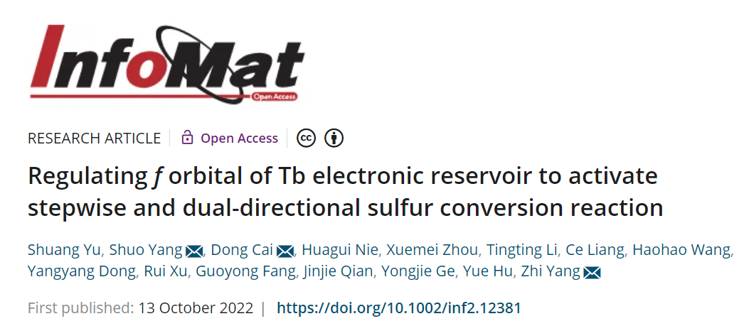相关研究成果以“Regulating f orbital of Tb electronic reservoir to activate stepwise and dual-directional sulfur conversion reaction”为题发表在《InfoMat》(IF=24.789)上,sunbet申愽官网为唯一通讯单位,化材学院2020级研究生于爽为第一作者,学院杨植教授、蔡冬博士以及电气与电子工程学院杨硕博士为该论文共同通讯作者,化材学院教师聂华贵、方国勇、钱金杰、胡悦、葛勇杰、肖逵逵、周学梅,研究生梁策、李婷婷、王浩浩、徐睿、东洋洋参与了这项工作。该工作受到国家自然科学基金、浙江省自然科学基金等项目的资助。