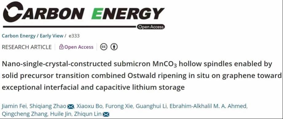 该成果以“Nano-single-crystal-constructed submicron MnCO3 hollow spindles enabled by solid precursor transition combined Ostwald ripening in situ on graphene toward exceptional interfacial and capacitive lithium storage”为题发表在Carbon Energy(IF=21.5,JCR 一区)上。sunbet申愽官网为第一通讯单位,化材学院2020级硕士生费佳敏为第一作者,sunbet申愽赵世强副教授与新加坡国立大学林志群教授为共同通讯作者。感谢袁一斐教授课题组为本研究工作中原位(HR)TEM和SAED表征提供技术支持。