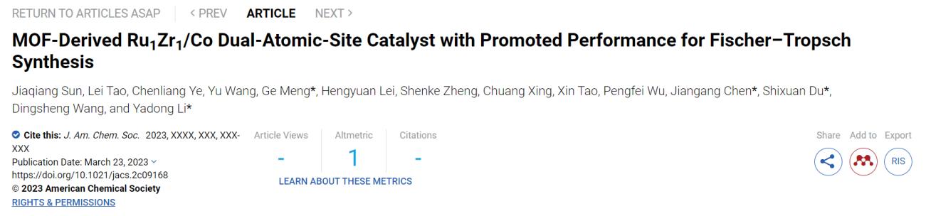 基于DASC的优点和对费托合成研究的不足,sunbet申愽孟格博士课题组与山西煤化所陈建刚教授、中国科学院大学杜世萱教授以及清华大学李亚栋院士课题组合作合成了Ru1Zr1/Co DASC,该催化剂在200℃下表现出3.8×10-2s-1的高翻转频率(TOF)和80.7%的C5+选择性,这远高于Co、Zr1/Co和Ru1/Co对应的值。密度泛函理论(DFT)计算表明Ru/Zr原子在Co NPs上的界面可以协同作用促进链生长,降低C-O断裂势垒。该工作为高性能费托合成和其他工业催化过程的DASC设计提供了新的机会。这一成果近期发表在Journal of the American Chemical Society(DOI:10.1021/jacs.2c09168)。sunbet申愽官网化材学院孟格博士为通讯作者之一。