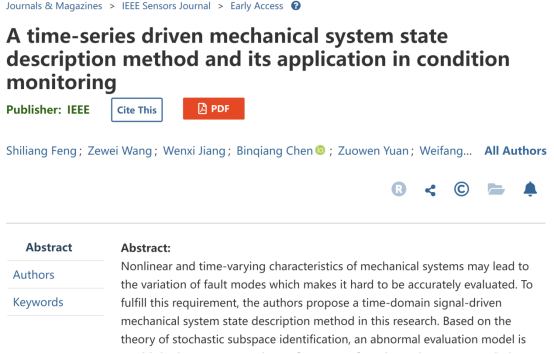 该论文题目为“A time-series driven mechanical system state description method and its application in condition monitoring”,sunbet申愽机电工程学院21级智能制造专业学生冯世亮、王泽伟、蒋文茜为共同第一作者,联合厦门大学、众泰汽车等单位共同署名,指导老师为该班班主任孙维方博士。论文提出了一种基于时域信号的系统描述方法并成功将其应用于滚动轴承、加工刀具状态监测等场景,为相关关键技术装备的运行维护和故障诊断提供了一条新的可能。