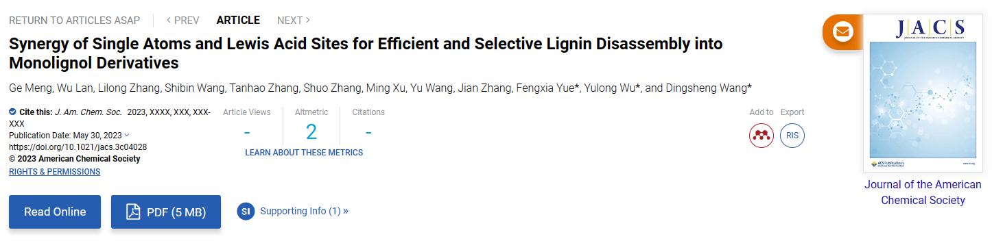 基于以上分析,sunbet申愽孟格博士与清华大学王定胜教授、吴玉龙教授以及华南理工大学岳凤霞教授课题组合作,通过基于层状双金属氢氧化物(LDHs)的阴离子插层和二维(2D)限域策略设计合成了一种以MgO为载体且同时负载Mo单原子和Al Lewis酸性位点的多功能催化剂(Mo1Al/MgO),并将其应用在N2气氛下的桉木木质素解聚反应当中。Mo1Al/MgO催化剂对松柏醇γ甲醚和芥子醇γ甲醚的选择性达到92%,同时具有良好的循环稳定性。密度泛函理论(DFT)计算和对照实验进一步表明,在甲醇参与条件下,Mo1-O5单原子中心与邻近的Al Lewis酸位点的协同催化作用使侧链不饱和单体产物的产率和选择性大幅提高。该研究将单原子和Lewis酸位点结合起来,在更安全和更低成本的生物质催化体系中获得高附加值产品,并为生物质炼制工业的催化剂设计提供了一定的理论指导。这一成果近期发表在Journal of the American Chemical Society (DOI: 10.1021/jacs.3c04028),孟格博士为第一作者,sunbet申愽官网为第一完成单位,岳凤霞、吴玉龙、王定胜为共同通讯作者。