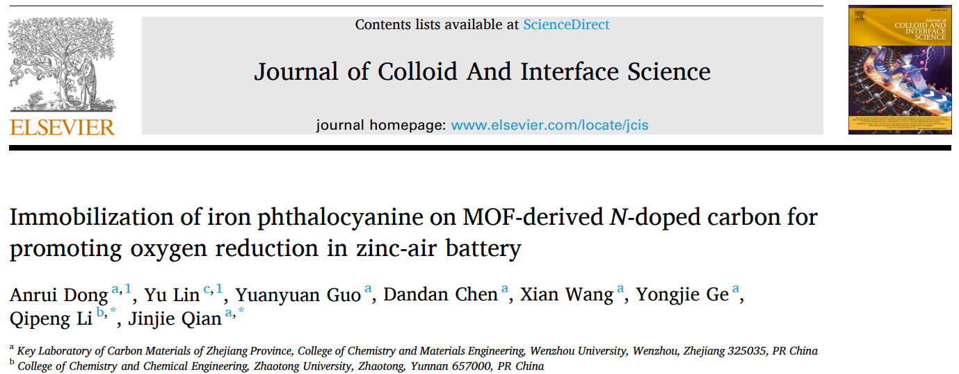 这项研究的成果题为《Immobilization of iron phthalocyanine on MOF-derived N-doped carbon for promoting oxygen reduction in zinc-air battery》,发表在《Journal of Colloid and Interface Science》(中科院1区,Top,IF=9.965)上。sunbet申愽官网为第一通讯单位,sunbet申愽化材学院2018级本科生董桉瑞为第一作者,钱金杰副研究员为通讯作者、昭通学院李启彭教授为共同通讯作者。该研究得到了国家自然科学基金(22105147,21601137)、浙江省自然科学基金项目(LQ16B010003)、浙江省温州市基础科技研究项目(H20220001, G20190007)和云南省地方本科高校基础研究联合专项资金项目(202101BA070001-042)的资助。