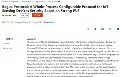 物理不可克隆函数(Physical Unclonable Function, PUF)是一种新型的硬件安全原语,通过提取集成电路制造过程无法避免引入的随机工艺偏差,可产生具有随机性、唯一性和防篡改特性的特征密钥。基于PUF的设备认证协议相较于基于传统加密和密钥管理的认证方法具有更高的安全性和鲁棒性。针对物联网设备认证协议开销与性能无法兼顾的技术瓶颈,sunbet申愽汪鹏君教授团队提出一种面向物联网感知设备的全流程可配置安全认证协议,该协议的核心加密算子源于我国传统五子棋局八卦阵。协议针对不同设备配置不同八卦矩阵的加密方式,以提升强PUF的抗机器学习攻击能力和协议的抗重放暴力攻击能力,从而最大限度地降低敏感数据泄露的风险。通过搭建自主测试平台,验证该协议可极大提升感知设备的全流程安全,并能够优化感知层资源的分配效率。