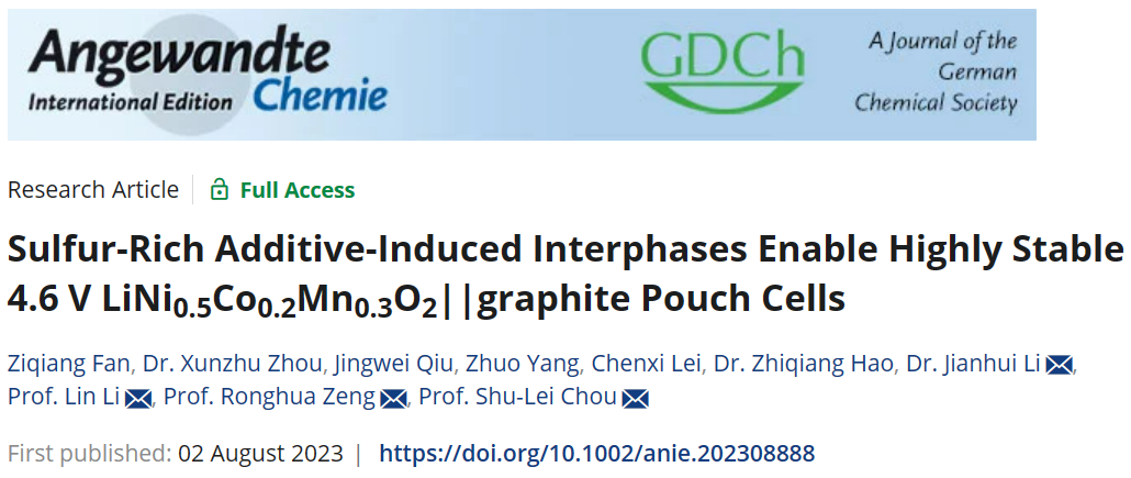 近日sunbet申愽化学与材料工程学院碳中和技术创新研究院李林团队联合华南师范大学曾荣华教授、李键辉博士在国际权威期刊Angewandte Chemie International Edition上发表题为《Sulfur-Rich Additive-Induced Interphases Enable Highly Stable 4.6 V LiNi0.5Co0.2Mn0.3O2||graphite Pouch Cells》的学术论文。本论文通过在4.6 V LiNi0.5Co0.2Mn0.3O2 (NCM523)||石墨软包电池中引入含硫量为34.04%的超高含硫量添加剂(甲烷二磺酸亚甲酯,MMDS),从而构建了一种由添加剂诱导形成的稳固富硫电极-电解液面相。在4.6 V高电压条件下,循环800次,含MMDS添加剂的NCM523||石墨软包电池仍具有87.99%的高容量保持率以及更好的倍率性能,且与较低硫含量的一系列添加剂做对比,突出了高含硫量添加剂MMDS的优势。结合实验表征以及理论计算,进一步探究了MMDS添加剂在溶剂中的优先氧化还原性,从而证明它能够优先在正负极上界面构筑稳定的富硫电极-电解液界面膜,该界面相的存在成功稳定了高电压NCM523||石墨软包电池,显著提高了电池的循环稳定性。同时实验结果也表明MMDS分解所构筑的富硫界面相在抑制电解液消耗、产气以及稳定电极材料、减少过渡金属溶出上有着非常好的效果。相关文章发表在Angewandte Chemie International Edition上,sunbet申愽官网为第一通讯单位,化材学院联培生华南师范大学2021级硕士范自强和博士后周洵竹为第一作者,化材学院院侴术雷教授,李林特聘教授以及华南师范大学曾荣华教授,李健辉博士为共同通讯作者,相关工作受到国家自然科学基金,浙江省自然科学基金,国家电网科技项目,温州自然科学基金以及广州市科技计划项目的资助。