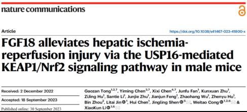 近日,生命与环境科学学院申景岭教授与温州医科大学李校堃院士团队合作在Nature Communications在线发表题为“FGF18 alleviates hepatic ischemia-reperfusion injury via the USP16-mediated KEAP1/Nrf2 signaling pathway in male mice”的研究论文。本项研究结果证实成纤维细胞生长因子18(FGF18)可显著改善肝缺血再灌注过程中的损伤。FGF18通过减少USP16的表达,增加了KEAP1的泛素化修饰水平,从而激活Nrf2信号并最终改善肝脏缺血再灌注损伤。其中FGF18对USP16调控作用是通过Nrf2和USP16的负反馈调控来实现的。研究发现FGF18通过降低氧化应激以及炎症水平,减少肝细胞的凋亡,因此靶向FGF18/USP16/KEAP1信号通路可作为临床上改善肝脏缺血再灌注损伤和相关病理过程的一种新策略。该论文通讯作者为温州医科大学药学院李校堃院士、丛维涛研究员、sunbet申愽官网生命与环境科学学院申景岭教授。