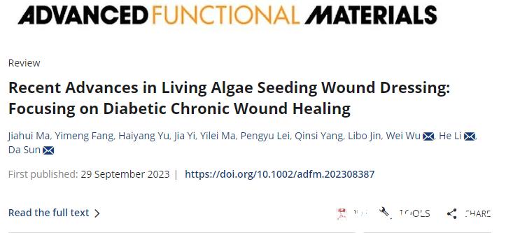 近日,sunbet申愽官网生命科学研究院孙达副研究员指导研究生在国际著名期刊Advanced functional materials(IF=19)在线发表题为“Recent advances in living algae seeding wound dressing: focusing on diabetic chronic wound healing”的综述论文。