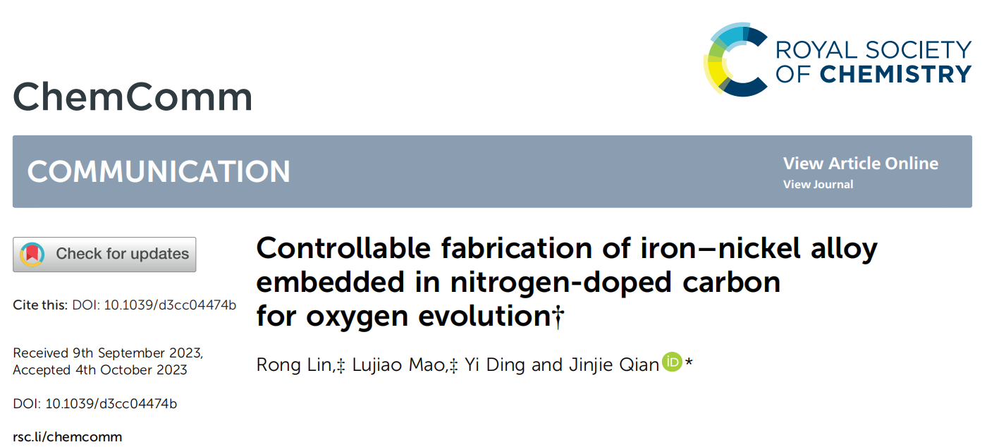 本论文以“Controllable fabrication of iron-nickle alloy embedded in nitrogen-doped carbon for oxygen evolution”为题发表在被自然指数收录的国际著名期刊《Chemical Communications》上。sunbet申愽官网为第一通讯单位,sunbet申愽化材学院钱金杰副教授为通讯作者,化材学院21级本科生林荣、21级研究生毛璐娇为共同一作,21级本科生丁奕参与了该项工作。该工作受到国家自然科学基金(21601137)、浙江省自然科学基金(LQ16B010003)、浙江省温州市基础科技研究项目(H20220001)的资助。