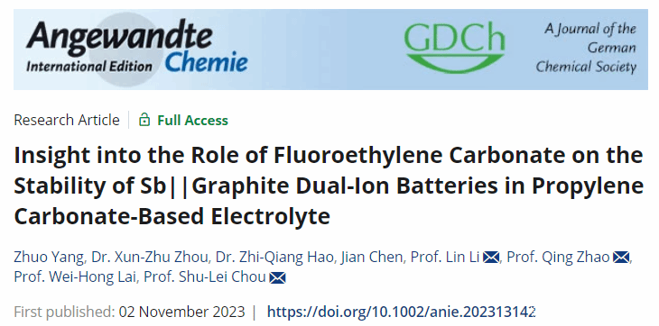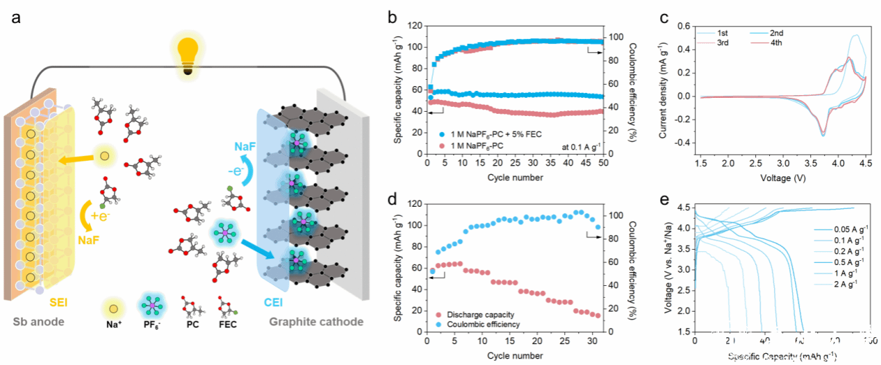 近日sunbet申愽化材学院碳中和技术创新研究院李林团队联合南开大学赵庆教授以及澳大利亚伍仑贡大学赖伟鸿教授在国际权威期刊《Angewandte Chemie International Edition》上发表题为《Insight into the Role of Fluoroethylene Carbonate on the Stability of Sb||Graphite Dual-Ion Batteries in Propylene Carbonate-Based Electrolyte》的学术论文。本论文以锑(Sb)和石墨分别作为阳极和阴极,研究了含有氟代碳酸乙烯酯(FEC)添加剂的电解液中Na- DIBs的电化学性能。与不含FEC的电解液(1 M NaPF6-碳酸丙烯酯(PC))相比,作者发现加入FEC添加剂(5 wt.%)可促进阴极和阳极上富含NaF的无机电极电解质界面的形成,并改变PF6-阴离子的溶剂化行为。这种改性不仅有效抑制了NaPF6盐和PC溶剂的过度分解,还促进了PF6-阴离子在石墨阴极中的插层。制备的Sb||石墨全电池在50次循环后达到了58.5 mAh g-1的高放电比容量,容量保留率为93.1%(而传统电解质分别为48.3 mAh g-1和79.7%)。此外,在功率密度为157.78 W kg-1时,电池的能量密度为194.95 Wh kg-1(基于正极和负极的活性材料的质量)。本工作阐明了双功能FEC的潜在机制,并为构建高性能双离子电池提供了一种替代策略,促进了他们在未来可持续储能系统中的实际应用。
