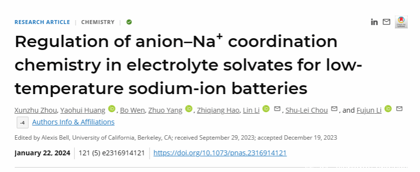 近日我院碳中和技术创新研究院李林团队联合南开大学李福军教授在国际权威期刊Proceedings of the National Academy of Sciences of the United States of America上发表题为“Regulation of Anion-Na+ Coordination Chemistry in Electrolyte Solvates for Low Temperature Sodium-Ion Batteries”的学术论文。文中选用高电子亲和能力的阴离子三氟乙酸根(TFA-)调控1.0 M NaPF6-G2电解液中的溶剂化学。该全氟阴离子的DN值高达34.0 kcal mol-1,其强配位作用使其全部参与内溶剂化鞘层,实现常规浓度下更多阴离子占据的溶剂化构型。与1.0 M NaPF6-G2电解液相比,增强的TFA-和降低的G2配位的溶剂化化学加速了界面Na+去溶剂化行为,呈现出较低的去溶剂化能(40至-20 ℃:3.49 vs. 4.16 kJ mol-1;-20至-60 ℃:16.55 vs. 24.74 kJ mol-1)。可诱导均匀稳定的Na沉积,实现25 ℃下500圈99.9%的超高超稳定的库仑效率。同时,Na||Na3V2(PO4)3电池在-40 ℃下循环呈现出60.2%的室温容量和100圈后99.2%的高容量保持率。这项工作为溶剂化化学调控助力高性能低温钠离子电池发展提供了新的见解。我院博士后周洵竹为第一作者,我院侴术雷教授,李林特聘教授以及南开大学李福军教授为共同通讯作者,相关工作受到国家自然科学基金,中国博士后科学基金及海河可持续化学转化实验室的资助。