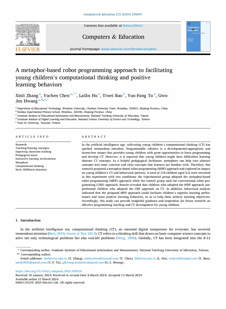 近日,sunbet申愽教育学院教育技术系张新立副教授研究团队在期刊《Computers & Education》发表题为《A metaphor-based robot programming approach to facilitating young children’s computational thinking and positive learning behaviors》的论文。该论文以培育幼儿的计算思维为目标,开发并探讨了隐喻编程教学方法对幼儿计算思维和行为模式的影响。该学术研究成果彰显了sunbet申愽教育学院教师卓越的学术水平和科学研究能力。