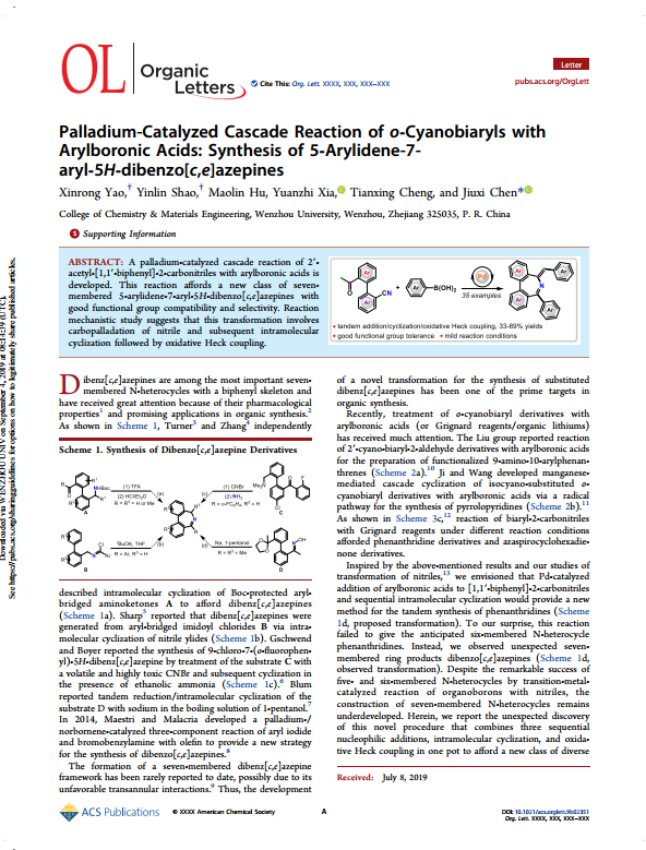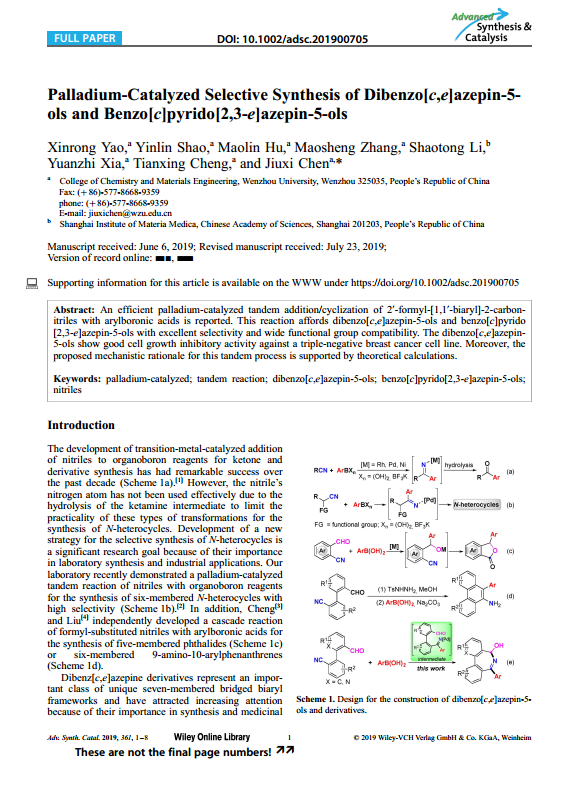 最近,我院2017级硕士研究生姚鑫容受课题组前期钯催化腈类化合物和芳基硼酸的串联反应(Org. Lett. 2017, 19, 218;Green Chem. 2017,19, 1740;Org. Lett. 2018,20, 3083;Adv. Synth. Catal. 2018,360, 3260)工作的启发,首次设计和开发出了基于氰基碳钯化策略合成一系列二苯并[c,e]吖庚因七元含氮杂环化合物,并将部分二苯并[c,e]吖庚因七元含氮杂环化合物通过细胞生长抑制试验的测试,发现其在三阴性乳腺癌细胞系MDA-MB-468中可以抑制细胞生长。此外,通过控制实验和密度泛函理论(DFT)计算,提出了可能的反应机理,相关结果于近期先后发表在Organic Letters(DOI: 10.1021/acs.orglett.9b02351)和 Advanced Synthesis and Catalysis(DOI: 10.1002/adsc.201900705)上。该成果第一次实现七元含氮杂环产物的合成,且实验反应过程创新,反应的原子经济性好,实现了传统方法难以发生的跨环串联反应。在未来的研究中,课题组将继续围绕氰基碳钯化策略合成具有药物活性的含氮杂环骨架化合物,将该课题的研究进一步深化。