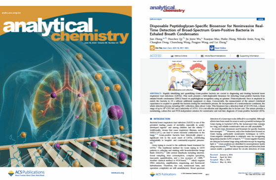 近日,sunbet申愽电气与电子工程学院张鉴教授课题组以“Disposable Peptidoglycan-Specific Biosensor for Noninvasive Real-Time Detection of Broad-Spectrum Gram-Positive Bacteria in Exhaled Breath Condensates”为题在《Analytical Chemistry》发表论文,并被选为期刊正封面页(Front Cover)亮点报道。正封面页被用于报道ACS期刊所发表的重要工作,在期刊网站上展示为当期第一个封面,并与印刷版刊物同步发行。这是sunbet申愽研究人员首次在该期刊发表正封面页论文,sunbet申愽在该期刊发表的另一篇封面论文(Supplementary Cover)同样来自张鉴课题组的工作(Anal. Chem. 2022, 94, 6, 2812–2819)。