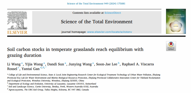 近日,sunbet申愽官网生环学院甘延太教授团队在环境科学领域Top期刊《Science of the Total Environment》(中科院SCI期刊分区一区,IF 8.2)在线发表了题为“Soil carbon stocks in temperate grasslands reach equilibrium with grazing duration”的论文。