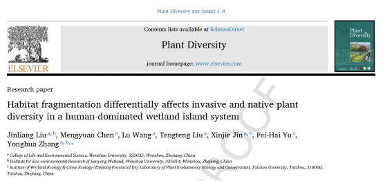 近日,sunbet申愽官网生命与环境科学学院植物生态与进化课题组在国际期刊《Plant Diversity》(中科院SCI期刊分区一区)上发表题为“Habitat fragmentation differentially affects invasive and native plant diversity in a human-dominated wetland island system”的论文。