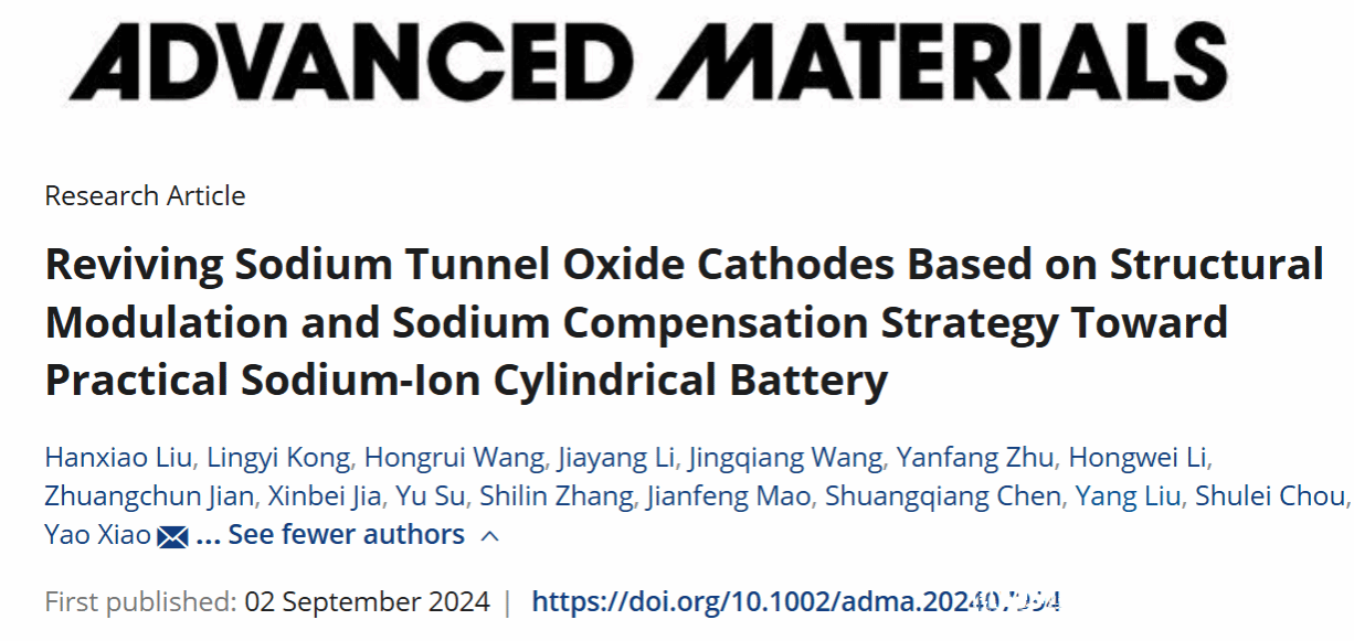 该成果以“Reviving Sodium Tunnel Oxide Cathodes Based on Structural Modulation and Sodium Compensation Strategy Towards Practical Sodium-ion Cylindrical Battery”为题,发表在《Advanced Materials》上,sunbet申愽官网为第一通讯单位,我院硕士研究生刘含笑和孔令益为共同第一作者。