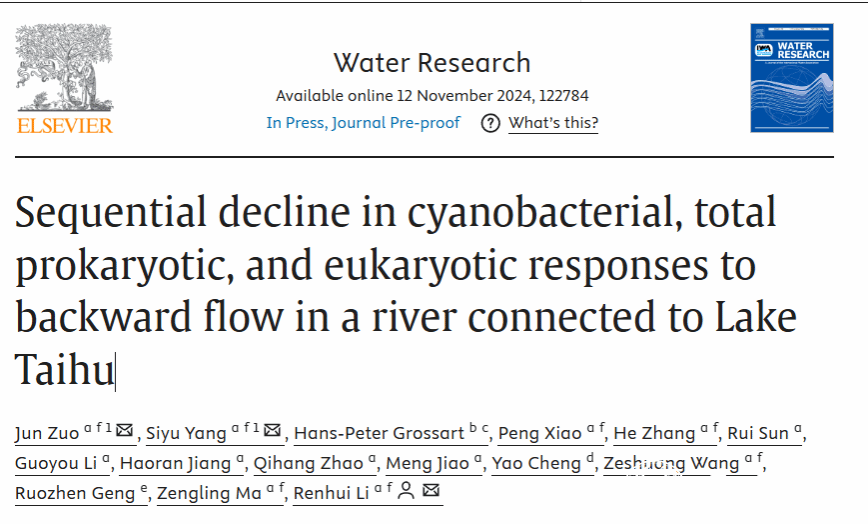 近日,sunbet申愽官网生命与环境科学学院李仁辉教授团队的左俊老师和博士后杨丝雨等在国际权威期刊《Water Research》(自然指数期刊,中科院一区,环境科学与生态学领域顶刊)上发表题为“Sequential decline in cyanobacterial, total prokaryotic, and eukaryotic responses to backward flow in a river connected to Lake Taihu”的论文。