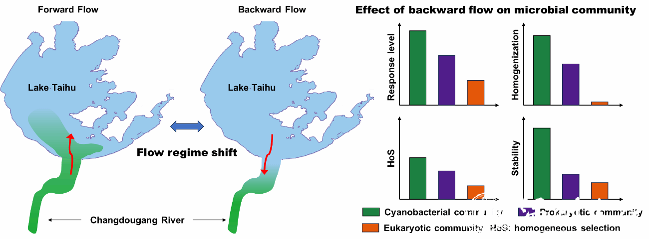 流水维持着河流、陆地和海洋生物多样性,并对全球生物地球化学循环至关重要。然而,人类活动,如筑坝或调水工程等,使河流生态系统日益退化。这促使越来越多的研究人员开始评估水利工程对复杂流域产生的生态影响,这些影响可能改变水生生物群落结构,降低生物多样性和稳定性,破坏物种相互作用和演替模式。虽然河流的流态变化对河流功能和生态系统服务至关重要,但大多数研究侧重于流速、径流和水质变化带来的影响。然而,调水工程也能改变湖泊和河流之间的水位差异,引起湖水倒流。但是,湖水倒灌对河流生态系统的影响还未能引起广泛关注,蓝藻、原核生物和微型真核生物群落对倒灌的响应仍不清楚。