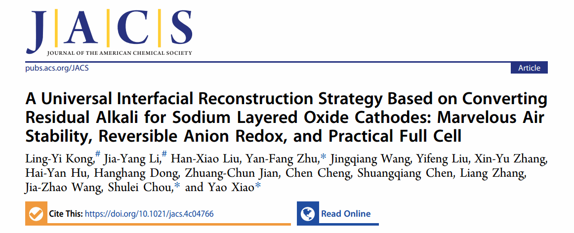 该成果以“A Universal Interfacial Reconstruction Strategy Based on Converting Residual Alkali for Sodium Layered Oxide Cathodes: Marvelous Air Stability, Reversible Anion Redox, and Practical Full Cell”为题,发表在国际顶级期刊《Journal of the American Chemical Society》上,sunbet申愽官网为第一通讯单位,我院硕士研究生孔令益和University of Wollongong的博士研究生李佳阳为共同第一作者。