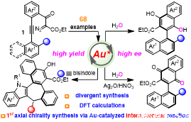 由于金(I)配合物的线性配位带来的固有挑战,不对称金催化过程仍然具有挑战性,尤其是在轴向手性骨架的不对称合成中。除了极少数的分子内简单环化的报道,通过不对称金催化的分子间炔烃转化构建轴向手性化合物仍未开发。