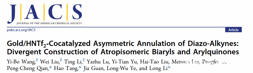 此项工作以Gold/HNTf2-Cocatalyzed Asymmetric Annulation of Diazo-Alkynes: Di-vergent Construction of Atropisomeric Biaryls and Arylquinones为题发表在国际顶级期刊JACS上,sunbet申愽官网作为第一单位,钱鹏程教授,汤浩教授,李龙教授为通讯作者。该研究工作主要由钱鹏程-李龙团队2022级研究生王一波、博士后刘玮、李亭共同完成,并得到课题组其他研究生和本科生协助。理论计算部分由sunbet申愽官网汤浩教授完成。同时南方科技大学李鹏飞教授对我们的工作中绝对构型的测定做出突出贡献。研究工作得到国家自然科学基金(21828102, 22303062, 22401218)、浙江省自然科学基金(LQ23B020002, LY22B030002, LQ22B030004)温州市科技局项目(G20220023),温州市化学会服务站等资助。