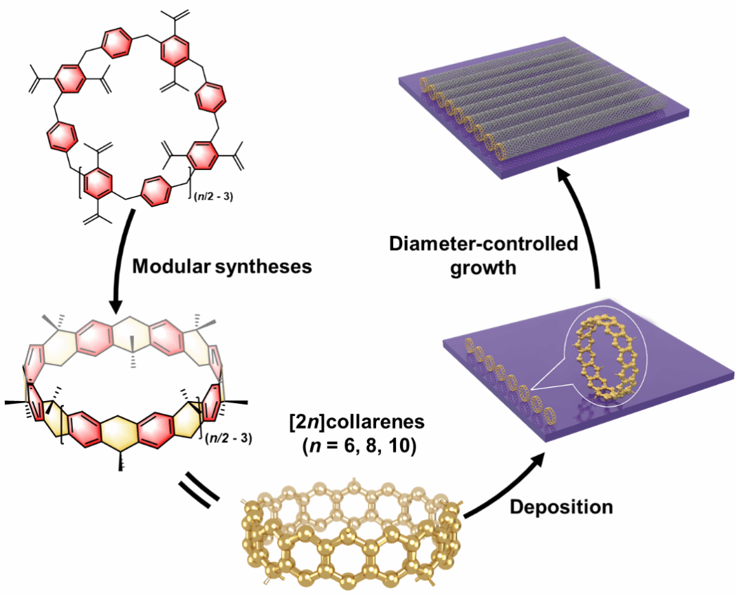 图1. 以领芳烃( [2n]collarenes)为刚性有机模板直径可控地生长SWCNTs的示意图
