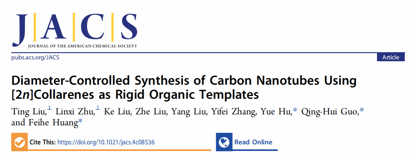 单壁碳纳米管(SWCNTs)因其卓越的理化性质而备受关注。碳纳米管的直径对其性质有着重要影响。因此,直径可控地合成SWCNTs对其实际应用至关重要。利用有机分子为模板实现SWCNTs的生长具有重要价值。首先,其结构明确,有利于SWCNTs的直径可控生长。其次,有机模板避免了金属污染问题。在过去十年中,使用有机模板(如CPP和曲面多环芳烃)生长SWCNTs取得了巨大的进展。然而,高效生长窄直径分布的SWCNTs仍然面临挑战。其中最大的阻碍是缺乏合适的模板分子。分子碳纳米带做为碳纳米管的最小重复单元,其刚性结构为SWCNT生长提供精准模板,有利于SWCNT直径可控制备,因此在碳纳米管生长领域引起了广泛关注。然而迄今为止,利用分子碳纳米带为模板实现SWCNTs的直径可控生长仍未被报道。近日,sunbet申愽官网胡悦特聘教授、清华大学郭庆辉副教授、浙江大学黄飞鹤教授合作在该领域实现了突破。