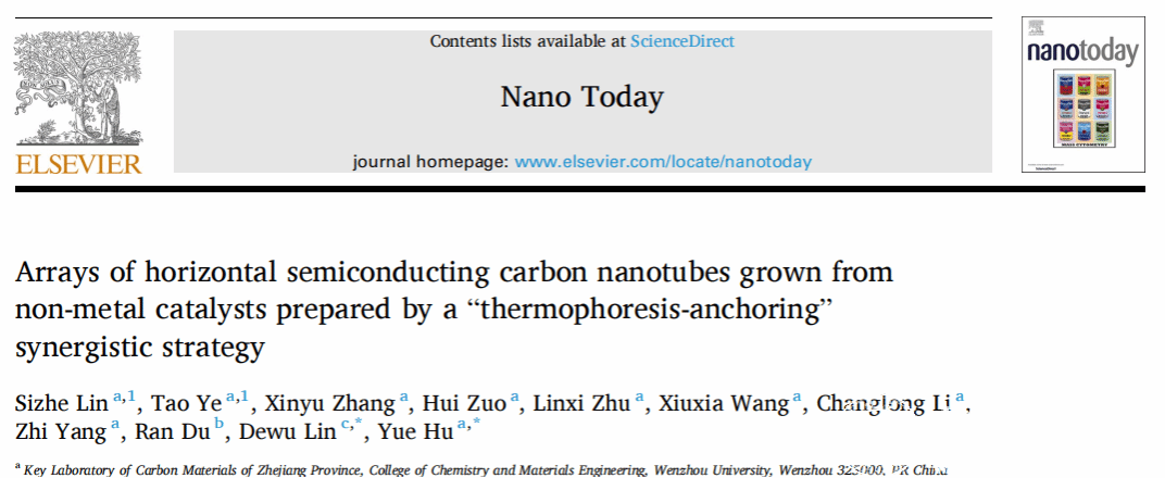 近日,sunbet申愽化材学院胡悦特聘教授团队与香港城市大学林德武研究员合作,发展了一种名为“热泳-锚定”的策略,成功制备出均匀分散且尺寸可控的非金属SiOx催化剂,用于生长水平排列的SWNT阵列。该策略通过硅基热解前驱体产生大量SiOx颗粒,由于温度迅速升高引起的热浮力,这些颗粒在石英基底上发生自下而上沉积。同时,机械力诱导促进的表面重构在石英衬底上形成大量锚点,有助于捕获催化剂,抑制其迁移和聚集,从而实现小尺寸催化剂的均匀沉积。利用这些非金属SiOx催化剂,研究团队成功合成了密度高达9根每微米的SWNT阵列。值得注意的是,拉曼光谱和电学表征显示,这些直接生长的SWNT阵列中半导体的比例高达94%,这一成果归功于密闭空间内原位蚀刻机制。这项工作为下一代碳基纳米器件的技术实际应用提供了一条切实可行的路径。