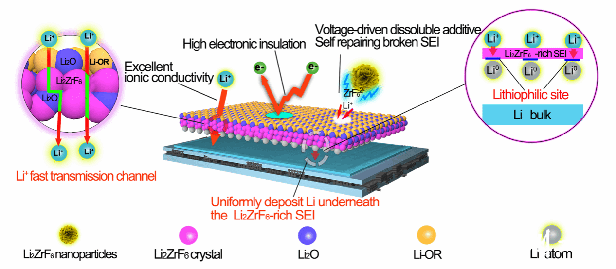 为解决以上问题,sunbet申愽化材学院居治金特聘教授与华南理工大学严克友教授、中科院物理所李泓教授、浙江工业大学陶新永教授合作,首次提出了以m-Li2ZrF6纳米颗粒作为电压驱动型电解液添加剂的概念(图1)。研究表明,在电场的驱动下,m-Li2ZrF6颗粒向电解液中大量释放ZrF62-离子,然后通过自发反应在金属锂负极表面原位形成富含t-Li2ZrF6晶体的SEI。DFT计算显示t-Li2ZrF6晶体具有优异的离子电导率,能够在t-Li2ZrF6晶体内部和t-Li2ZrF6/Li2O所构成的晶界中,为Li+提供快速迁移的通道。基于t-Li2ZrF6组分独特的物理化学性质,富含t-Li2ZrF6的SEI具备了高离子电导率、高电子绝缘性和高电化学稳定性等理想型SEI必备的三大特征。此外,富含t-Li2ZrF6的SEI中t-Li2ZrF6晶体表面丰富的亲锂位点还能够促进金属锂的均匀沉积,抑制锂枝晶的产生。更重要的是凭借电压驱动解离释放ZrF62-功能离子特性,m-Li2ZrF6添加剂不仅能够改善传统添加剂在循环中被耗尽的缺陷,还能够通过ZrF62-离子及时修复破损的富含t-Li2ZrF6的SEI,为金属锂负极的界面稳定提供长期保护。基于上述优势,m-Li2ZrF6纳米添加剂能够使锂金属电池在超高面积载量和超大电流密度下稳定循环3000次,且拥有>80%的容量保持率。这项工作为金属锂负极界面保护研究提供了新的解决策略和材料,同时也为锂金属电池的实际商业化应用提供了可能。